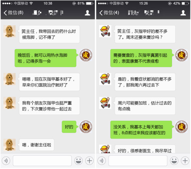 治疗过程:后经同学介绍来到南京肤康,采用中医特色疗法治疗,治疗后第4次来医院的时候,脚上的灰指甲已经完全好了。