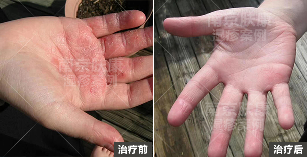 治疗前:手部一块一块的丘疹,越抓越痒,出现皮损情况。
