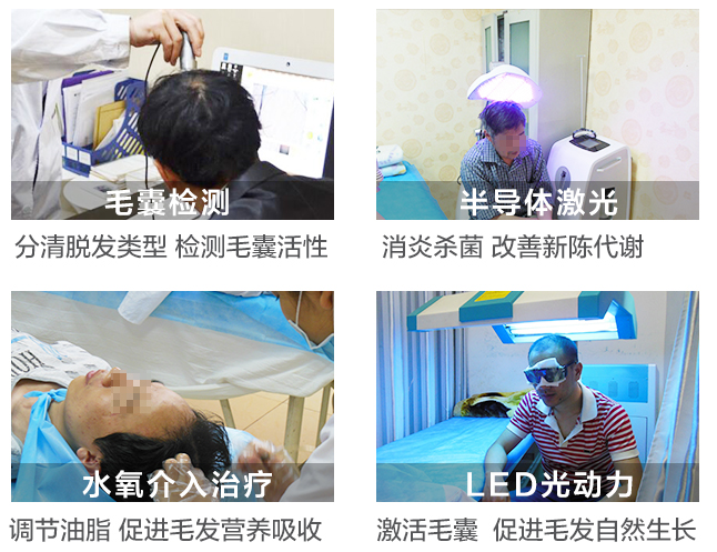 治疗关键:先中药调理消除炎症,调节油脂分泌,再配合物理仪器治疗阻断雄性激素和毛囊靶细胞内的受体结合,激活毛囊、加快新陈代谢, 促进头发营养成分吸收,毛发即可自然生长。